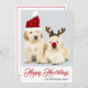 Este diseño navideño presenta una foto de dos cachorros de Golden Retriever que llevan sombreros rojos de Navidad y el texto "Feliz Howlidays" escrito en tipografía roja popular con un apellido añadido debajo. La parte posterior de la tarjeta tiene el mensaje "Pensamientos cálidos y mejores deseos para una maravillosa temporada navideña y un año nuevo muy feliz". Para personalizar, puede agregar su propia foto y editar el texto.