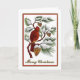 Esta tarjeta de Navidad ofrece una sentada cardinal roja en una rama nevosa del pino con los conos del pino, rodeados por un rojo y un marco del oro.