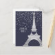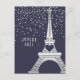 Estas postales inspiradas francesas del navidad ofrecen una falsa imagen de plata de la torre Eiffel, con un saludo del día de fiesta y un un montón de nieve del invierno, todos en un fondo azul de medianoche profundo.