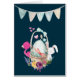 Una tarjeta de felicitación para bebé/ducha de bebé con un cartel de aposento colgado sobre un lindo ilustracion acuático de un huevo sentado dentro de una canasta de mimbre. Decorado con cintas, arcos, flores y corazones pequeños. Un flamingo rosa y un conejo blanco se sientan a ambos lados esperando pacientemente el gran día. El interior de la tarjeta tiene un cartel de agrupamiento y un mensaje personalizado.