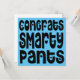 Diga felicitaciones fuertes y claras en estilo divertido al graduado o a cualquiera para que lo felicite con esta gran tipografía audaz Felicitaciones a los Pantalones Inteligentes con un tipo de letra peculiar negro con motivos cardíacos. Personalice fácilmente con su mensaje al revés. También puede cambiar el fondo azul a otro color si lo desea, así como el tipo de letra y color del saludo de la parte posterior a través de la opción Personalizar Más adelante.