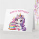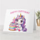Feliz tercer cumpleaños. Tres años. Cute unicornio en colores rosa y lila. Un pastel de cumpleaños con una Vela Número Dos. Una adorable tarjeta de cumpleaños para niños. Esta tarjeta está en blanco dentro para su propio mensaje. También disponible como descarga digital para su transferencia a otros productos.
