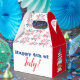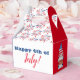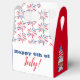 Hooray por el rojo, blanco y azul. Esta divertida cuarta caja de favores está decorada en colores patrióticos. Los paneles frontal y posterior tienen un fondo blanco con fuegos artificiales el 4 de julio y un mensaje que dice "Feliz 4 de julio". Un panel lateral es azul, el otro, rojo. Cada panel tiene un gnomo patriótico.