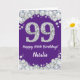 Feliz 99º Cumpleaños Tarjeta Purpurina Púrpura y Plata con nombre personalizado. Para una mayor personalización, haga clic en el botón "Personalizar" y utilice nuestra herramienta de diseño para modificar esta plantilla.