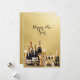 En dorado, el texto Feliz Año Nuevo rodea un marco brillante de diamantes. Un paisaje urbano en