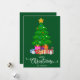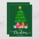 Green Merry Christmas en forma de guion con un gráfico de un árbol de Navidad y regalos envueltos bajo su diseño. Esta tarjeta de Navidades de color de fondo verde está diseñada para que pueda cambiar el color del fondo e introducir también el nombre de su familia. También puede editar este diseño para cambiar el color de la palabra "Navidades" si lo desea.