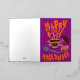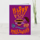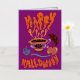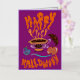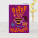 Ilustracion original en audaces colores modernos naranja y violeta en un estilo máximo con espeluznantes letras a mano diciendo Feliz Halloween viniendo como vapor con pequeños fantasmas adorables de la taza de café de una bruja amante del gato con vidrio venenoso de poción, varita mágica, calabaza y murciélago volador.