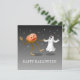 Una linda tarjeta feliz de Halloween con una calabaza y un fantasma que han iniciado el fiesta de disfraces y empezaron a bailar.