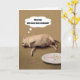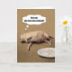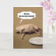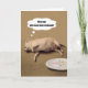 La humorística tarjeta de cumpleaños muestra una foto de un chubby chihuahua que acaba de pulir una torta de cumpleaños fenomenal, dejando solamente algunas migajas y velas.