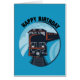 Una tarjeta de cumpleaños muy linda para enviar tus mejores deseos en un día de celebración. Un tren negro sobre fondo azul con ventanas rojas. Un ilustracion adecuado para un niño, un adolescente e incluso una sorpresa graciosa para un hombre a quien le gustan los vehículos.