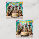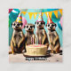 Se muestran cuatro suricatas, tres con sombreros de cumpleaños y de pie detrás de un pastel de cumpleaños con las palabras Feliz Cumpleaños.