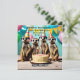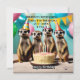 Se muestran cuatro suricatas, tres con sombreros de cumpleaños y de pie detrás de un pastel de cumpleaños con las palabras Feliz Cumpleaños.