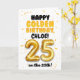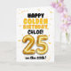 ¡Celebra cumpliendo 25 años el día 25 con esta tarjeta de Feliz Cumpleaños Dorado! Diseñada con un tema dorado brillante y alegre, esta tarjeta presenta un diseño divertido y audaz con detalles de confeti y un gran número de globo dorado. ¡Personalízala con un nombre en la parte delantera y en el interior de la tarjeta para hacer su cumpleaños dorado aún más especial!