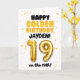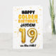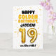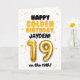 ¡Celebra que tu hijo cumple 19 años el día 19 con esta tarjeta de Feliz Cumpleaños Dorado! Diseñada con un tema dorado brillante y alegre, esta tarjeta presenta un diseño divertido y atrevido con detalles de confeti y un gran número de globo dorado. Personalízala con un nombre en la parte frontal y en el interior de la tarjeta para hacer que su cumpleaños dorado sea aún más especial.