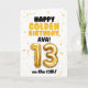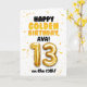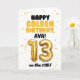 ¡Celebra que tu hijo cumple 13 años el día 13 con esta tarjeta de Feliz Cumpleaños Dorado! Diseñada con un tema dorado brillante y alegre, esta tarjeta presenta un diseño divertido y audaz con detalles de confeti y un gran número de globo dorado. ¡Personalízala con un nombre en la parte delantera y en el interior de la tarjeta para hacer su cumpleaños dorado aún más especial!