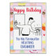 Tapón de calefacción central y personalizado de tuberías. El ingeniero de calefacción está trabajando en arreglar una caldera. Personaliza con tus propios detalles y mensajes. Pasteles de fondo. Tarjeta de cumpleaños para un ingeniero de calefacción.