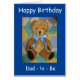 Foto de lindo pequeño peluche con arco azul y borde azul. El mensaje es "Feliz cumpleaños a papá".