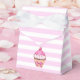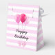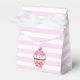 Caja de quequitos de cerezo rayado rosa, fondo rayado rosado con arcos y globos. Cumpleaños.