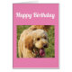 Esta linda tarjeta de perro dorado rosa y negra feliz cumpleaños presenta una adorable foto de un cachorro dorado. Añade tu propio mensaje de personalizado, cambia el color de fondo o cambia la foto para hacer de este diseño tu propio! Fotografía creada por la galardonada fotógrafa Maria Jeffs.