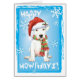 Envíen saludos navideños con esta tarjeta de un lindo cachorro de Dogo Argentino usando un sombrero de Papá Noel y una bufanda a rayas en medio de copos de nieve y las palabras, ¡Feliz Amanecer! Ideal para los amigos y familiares amantes del Dogo. ¡Que tengas un feliz cumpleaños!