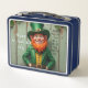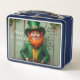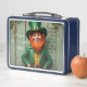 Un leprechaun sonriente con un traje verde tradicional y una gran sonrisa esparce buena alegría. La pared rústica de madera en el fondo, decorada con rocas de champú y un sincero refrán irlandés, le confiere un ambiente festivo y encantador. Perfecto para saludos y decoraciones del Día de San Patricio.