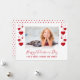 Esta tarjeta de foto El día de San Valentín para amigos o familia incluye un diseño móvil de corazones rojos a cada lado y rodea tu foto digital en el centro. "Feliz Día de San Valentín" se imprime debajo de la foto en un guión rojo decorativo con el cierre y el nombre en un tipo de letra rojo moderno que se complementa. Personalice el texto y la foto en los campos de la plantilla proporcionada. Los puntos rojos de polka adornan la parte de atrás. "Haga clic en Personalizar más adelante" para cambiar el color de fondo o el estilo de fuente, color. Tu foto debería tener un tamaño horizontal similar para llenar el espacio. Por favor, sube a 300 dip para obtener la mejor calidad de impresión.