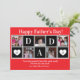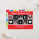 A papá le encantará esta tarjeta personalizada del Día del Padre. Hay plantillas para 5 de tus fotos favoritas de los niños en un patrón de bloques con P A P Á escrito en el medio y un corazón a cada lado con el año. En la parte inferior hay un mensaje personal para papá. Úsalo como está, o agrega tu propio mensaje. Personaliza con los nombres de los niños debajo de eso. El fondo es rojo y el reverso es un patrón de puntos de diferentes tamaños en rojo, azul, amarillo y verde.