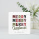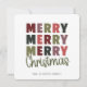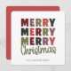 Comparte la alegría navideña con esta encantadora tarjeta de Navidad que presenta un diseño audaz de “Merry Merry Merry Christmas”. Perfecta para enviar cálidos y festivos deseos, esta tarjeta moderna incluye texto totalmente editable en la parte inferior donde puedes personalizar el nombre de tu familia. Su diseño simple y elegante hace que sea fácil de personalizar y crear un preciado recuerdo que tus seres queridos adorarán. Ideal para envíos navideños, saludos familiares y celebraciones de temporada.