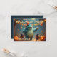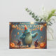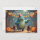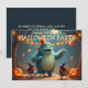 Diseño colorido de la fiesta de Halloween con un alegre monstruo azul, niños disfrazados, globos y luces de cuerdas. Perfecto para una vida amigable con los niños, lúdica y divertida, llena de alegría, imaginación y espíritu festivo.