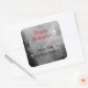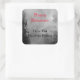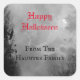 Una pegatina personalizada de Feliz Halloween en letras rojas de estilo negro antiguo y letras rústicas negras contra un cielo de Halloween con árboles brumosos, cuervos góticos y una luna llena nublada en negro, blanco y gris.