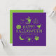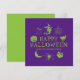 Feliz Halloween nombre personalizado tarjeta de saludo espeluznante, invitación púrpura y verde con personalizable jack de texto o linterna, calabaza, bruja, fantasma, cráneo, luna, gato negro
