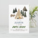 Esta tierna invitación para acampar "alegre acampador" para niños de 1er/primer cumpleaños tiene un fondo blanco con una carpa, un oso, árboles y montañas. En el reverso, un fondo azul marino con motivos de madera. Personalízalo para tus necesidades. Puedes encontrar productos coincidentes en mi tienda.