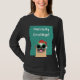 Diseño de Navidades con un pug con gorras de Navidades y gafas de sol y texto blanco Feliz saludo a la familia! con fondo de árboles de Navidad verde.