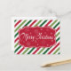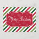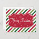 Feliz ilustracion navideño con texto y diseño de copos de nieve sobre fondo rayado rojo, blanco y verde