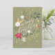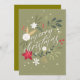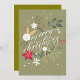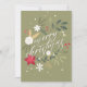 Un suave acercamiento a una tarjeta de Navidad bellamente diseñada que presenta un exuberante arreglo de flores y follaje festivos. Los colores vibrantes rojo, blanco y verde crean una atmósfera cálida mientras la cámara se desplaza lentamente por los intrincados detalles de los elementos florales. La elegante escritura 'Feliz Navidad' resalta sobre el fondo verde apagado, invitando a un espíritu navideño acogedor. La iluminación suave y difusa realza las texturas de la tarjeta, creando un ambiente sereno y alegre, perfecto para la temporada.