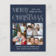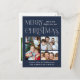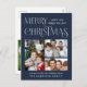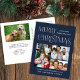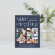Elegante postal de vacaciones azules con "Feliz Navidad" en elegante tipografía blanca vintage, "feliz año nuevo" y un saludo en tipografía blanca moderna, tres de tus fotos favoritas y tu nombre. En la parte de atrás, agregue una cuarta foto y personalice su mensaje de temporada a su familia y amigos.