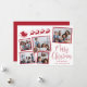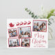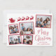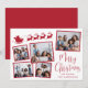Tarjeta navideña festiva con un collage de 5 fotos de imágenes dispersas en marcos rojos, una silueta roja de renos que vuelan el trineo de Santa, "Feliz Navidad" en un elegante guión rojo y tu nombre en una simple tipografía roja moderna.
