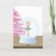 Este adorable diseño de tarjetas de felicitación navideña incluye una bailarina rubia en un tutu azul bailando en un globo de nieve sobre una mesa/estantería de madera frente a un árbol de Navidad rosa con texto de "Feliz Navidad".