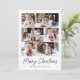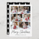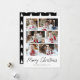 Tarjeta de vacaciones moderna con 6 fotos dispuestas en forma de collage. "Feliz Navidad" se muestra en un guión negro escrito a mano con el nombre de tu familia y el año que se muestra a continuación. La tarjeta multifoto de vacaciones se revierte para mostrar un patrón de árbol de Navidad en blanco y negro.