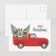 Ilustracion lindo de tres perros cabalgando en la parte trasera de una pequeña camioneta roja con árboles de Navidad.