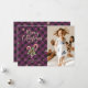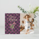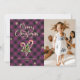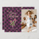 Foto personalizado Tarjeta navideña con un elegante guión y Navidades con latas de caramelo, bayas azucaradas y rojas contra un fondo de manta de búfalo morado en el frente y copos de nieve en la parte posterior. Personaliza fácilmente esta tarjeta de vacaciones morada con tu foto y texto.