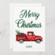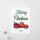 Una hermosa tarjeta de vacaciones con el guión moderno de caligrafía Feliz Navidad y el año con un camión clásico de color de agua rojo cargado con un árbol de Navidad y regalos para todos.
