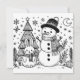 Tarjeta postal de Navidad personalizada con páginas para colorear. Las páginas para colorear son un muñeco de nieve y un conejito con árboles de Navidad, la luna y copos de nieve en la parte frontal. La parte trasera de la tarjeta postal tiene un mensaje de vacaciones que puedes personalizar.