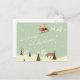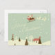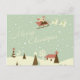 Feliz Navidad con Santa Claus, Rudolfs, en cascadas de nieve. Niza ilustracion Vintage Diseño navideño de Feliz Navidad con Santa Claus en la trineo con su reno entregando juguetes en la víspera de los Navidades. San Nicolás sobrevolando el cielo con casas, árboles de navidad, pinos, snowman y renos. El paisaje nevado y la nieve caen sobre un fondo verde verde azulado claro.