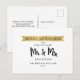 Feliz Navidad de futuro Sr y Sra. La tarjeta postal es perfecta para que una pareja recién comprometida envíe saludos navideños. El diseño presenta una hermosa tipografía de estilo de letra a mano con pincel con una pancarta de cinta de falso foil dorado debajo de las palabras "Feliz Navidad". En el reverso de la tarjeta, el diseño presenta espacio para saludos. Personalice el diseño reemplazando el texto de muestra. Por favor, póngase en contacto con el diseñador si tiene alguna solicitud de personalización de diseño.