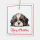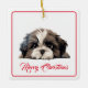Feliz Navidad desde el ornamento de cerámica de perro. Un divertido adorno navideño para saludos navideños del perro para familia y amigos. Personalice en la parte de atrás. Dulce Shih Tzu Cuppy delante.