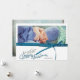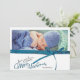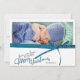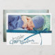 Feliz Navidad desde nuestra casa a la tarjeta de vacaciones de sus Navidades. Una carta de vacaciones simple y hermosa, de color blanco, azul verde azulado y verde oscuro con acento de cinta. Impresión de coordenadas en el reverso. Moderno, elegante y personalizable con su propia foto y apellido. Diseño del Emporium de Jenn.