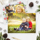 La tarjeta de fotos navideña de estilo clásico presenta un diseño de dos caras con cuatro (4) fotos, el guión blanco "Feliz Navidad" cubierto de texto personalizado, y ilustraciones de Navidades huecas, bayas, poinsettias, ramas de pino y bellotas que enmarcan las fotos mostradas en la parte posterior de la tarjeta. El fondo tiene una sutil apariencia texturada de tejido con un punto gris claro. El diseño incluye colores rojo, burdeos, verde, azul hielo y gris.