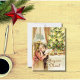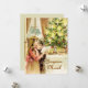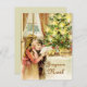 Gráfico vintage de Navidad de Hungría 1902. Colores claros y escena festiva con dos niños pequeños leyendo una carta mientras están parados al lado del árbol de Navidad iluminado con velas. Está nevando afuera. Esta versión viene con el deseo de los Navidades franceses " Joyeux Noel " .