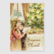 Tarjeta magnética con gráfico vintage de Navidad de Hungría, 1902. Colores claros y escena festiva con dos niños pequeños leyendo una carta mientras están parados al lado del árbol de Navidad iluminado con velas. Está nevando afuera. Esta versión viene con el deseo de los Navidades franceses " Joyeux Noel " .